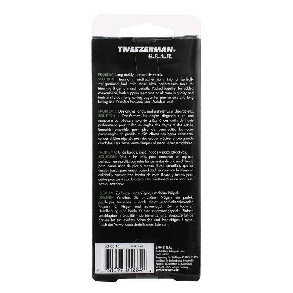 Tweezerman Gear Nail Clipper Set is the clean-cut pair which trims fingernails and toenails. Transform unattractive nails into perfectly well-groomed with these high-performance tools packed together for added convenience. Both clippers feature sharp, strong cutting edges for precise cuts and long-lasting usage. Made from durable stainless steel.