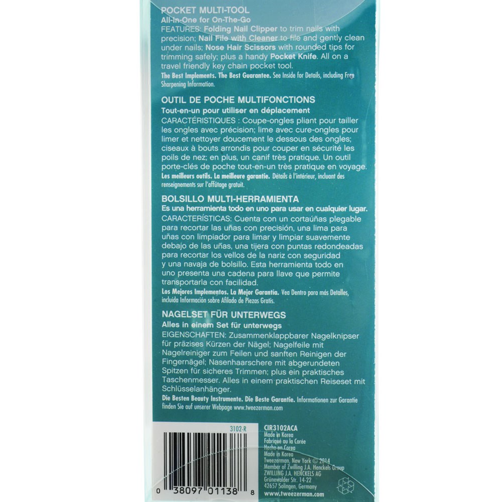 Tweezerman Pocket Multi-Tool fits in your pocket for perfect portability! Consisting of every essential tool for instant grooming, this Tweezerman pocket multi-tool is ideal for stashing in your pocket, bag or office drawer for grooming on the go. Complete with key chain for easy travelling. Tweezerman is made from premium quality, polished stainless steel.