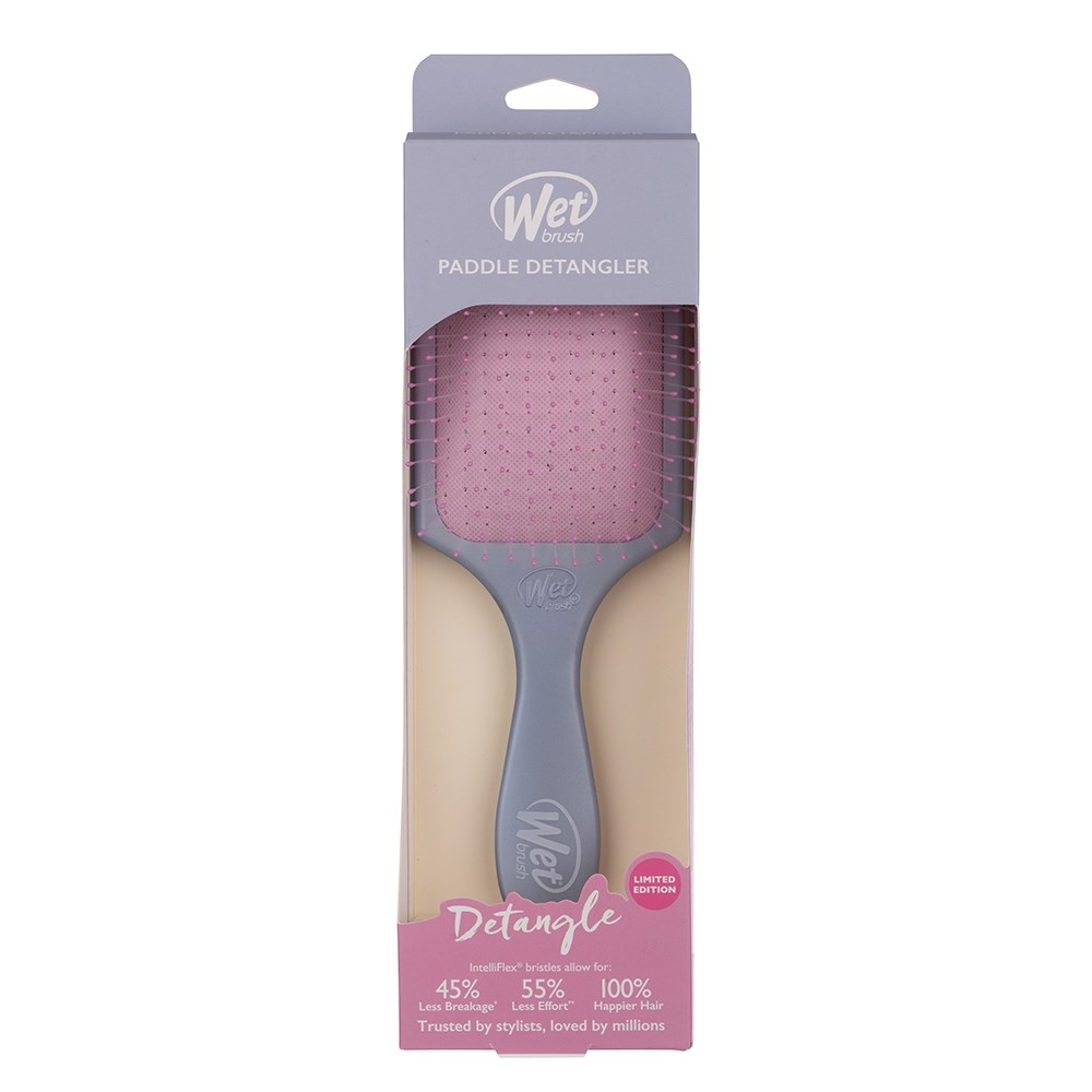Meet the WetBrush Feel Good Ombre Paddle Detangler Purple. Spread conditioning treatments and hair masks through hair with effortless ease. The vented design makes it easy for water and excess product to escape the brush, ensuring there’s no leftover build-up. Cleaning the brush is a breeze - just rinse and repeat. 20% larger surface area spreads treatments and masks evenly through hair. Also adept at detangling, ultra-soft IntelliFlex bristles glide through tangles without pulling or breaking hair. Feel good in Wet Brush limited edition ombre!
