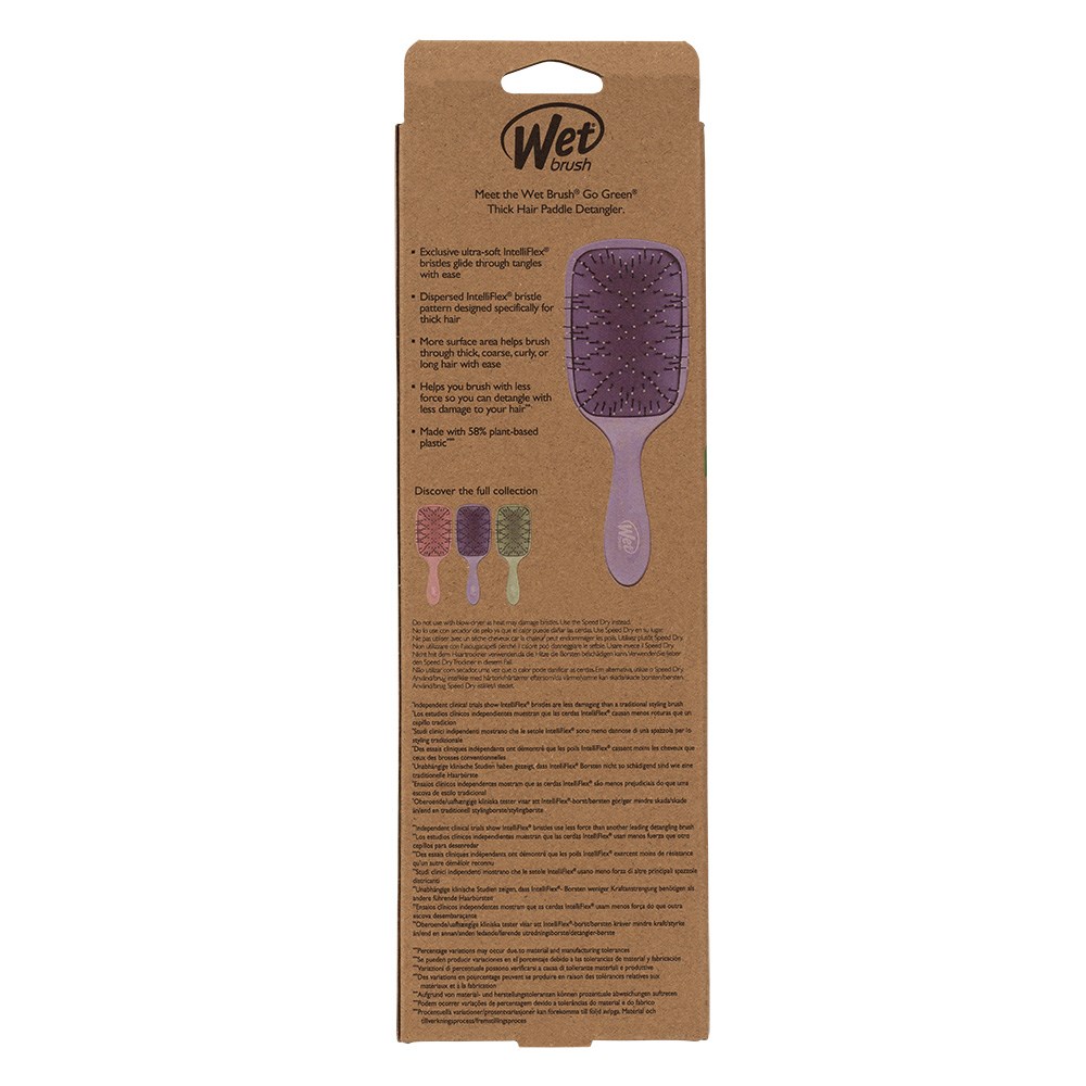 Go green! Meet the WetBrush Go Green Thick Hair Paddle Detangler Purple, the detangling brush which won’t hurt hair or the environment. With a brush body made from 58% plant-based plastic, this brush is designed with a larger paddle and a unique bristle pattern to allow you to easily brush through thick, coarse, curly, and long hair. Exclusive, ultra-soft IntelliFlex bristles glide through wet or dry hair without pain, breakage, or damage. Wet Brush AquaVent design allows water to drain from the brush. Great for spreading hair treatments and masks easily.