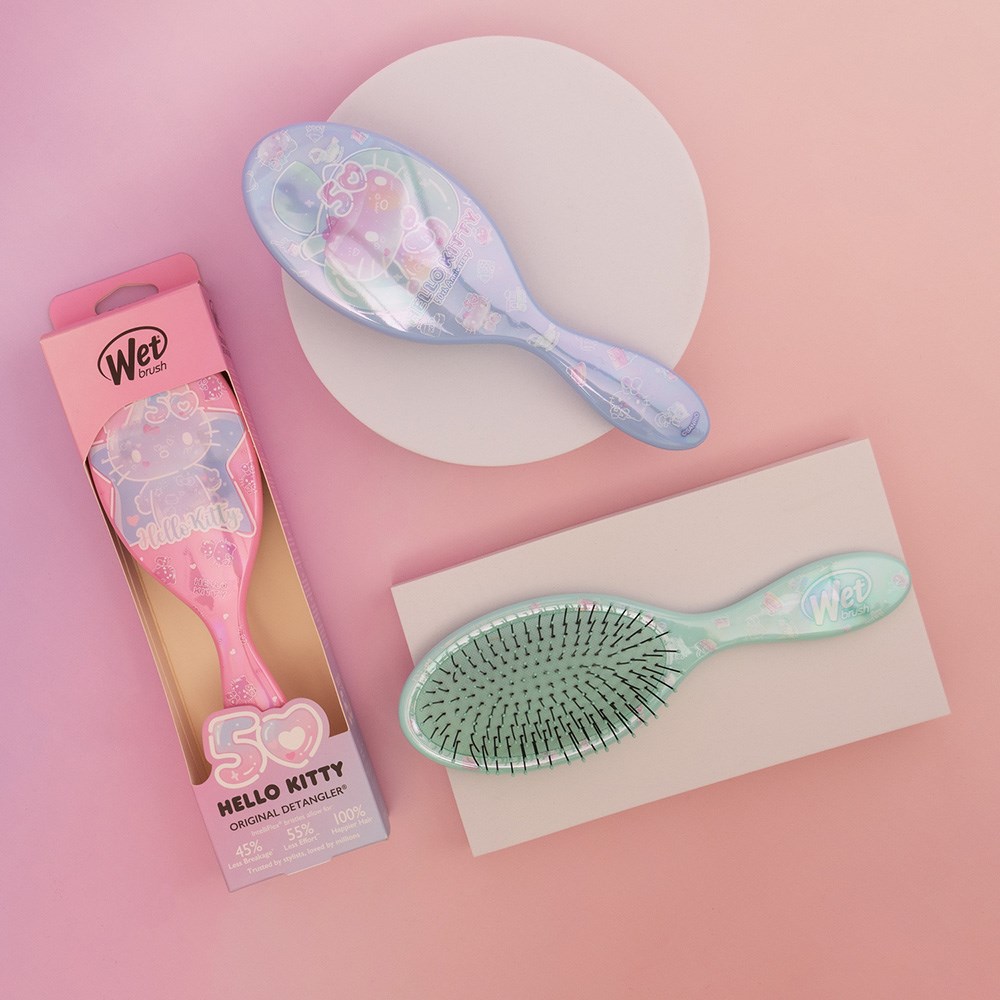 Celebrate Hello Kitty’s 50th birthday with the original, award-winning detangling brush! WetBrush Hello Kitty 50th Birthday Detangler Green gently loosens knots on wet or dry hair without pulling or snagging. The moment you use it, you’ll feel the difference and never want to try another detangling brush again. Exclusive, ultra-soft Wet Brush IntelliFlex bristles glide through tangles on all hair types with ease. Minimise pain and protect against split ends and breakage. Brush with less force so you can detangle with less damage to hair. A super special Hello Kitty birthday edition!