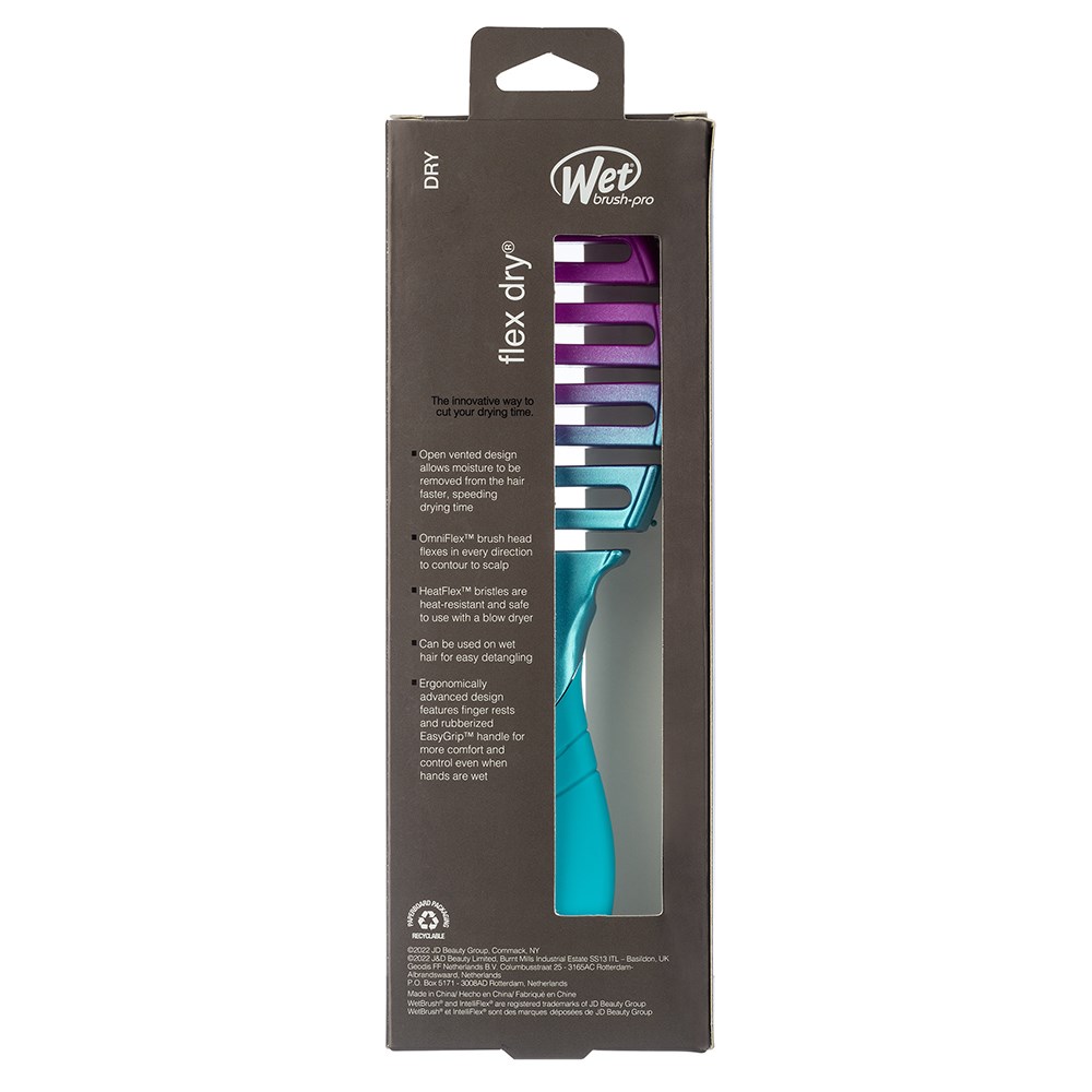 The innovative way to speed up blow-drying time. WetBrush Pro Flex Dry Hair Brush Teal Ombre features an open, flexible vented design to allow moisture to be removed from hair faster. Clever OmniFlex brush head flexes in every direction to contour to the scalp. With heat resistant HeatFlex bristles and an ergonomically advanced design, Wet Brush Pro Flex Dry vent brush is designed by stylists for stylists.