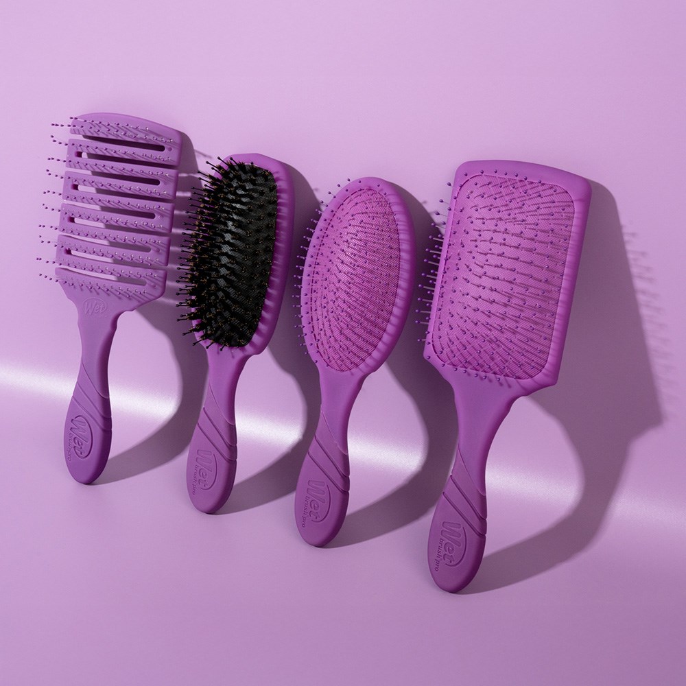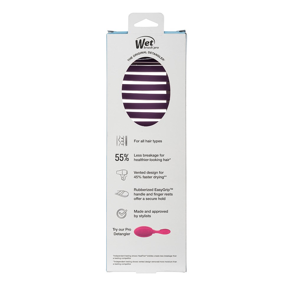 Stylists’ fave way to faster hair drying. WetBrush Pro Frost Flex Dry Paddle Detangler Purple features a flexible vented paddle design to speed up dry time while contouring to the scalp for comfort. HeatFlex bristles are heat resistant and safe to use with a blow-dryer. OmniFlex brush head flexes in every direction to contour to scalp. This hair brush has a 20% larger surface area for faster styling.