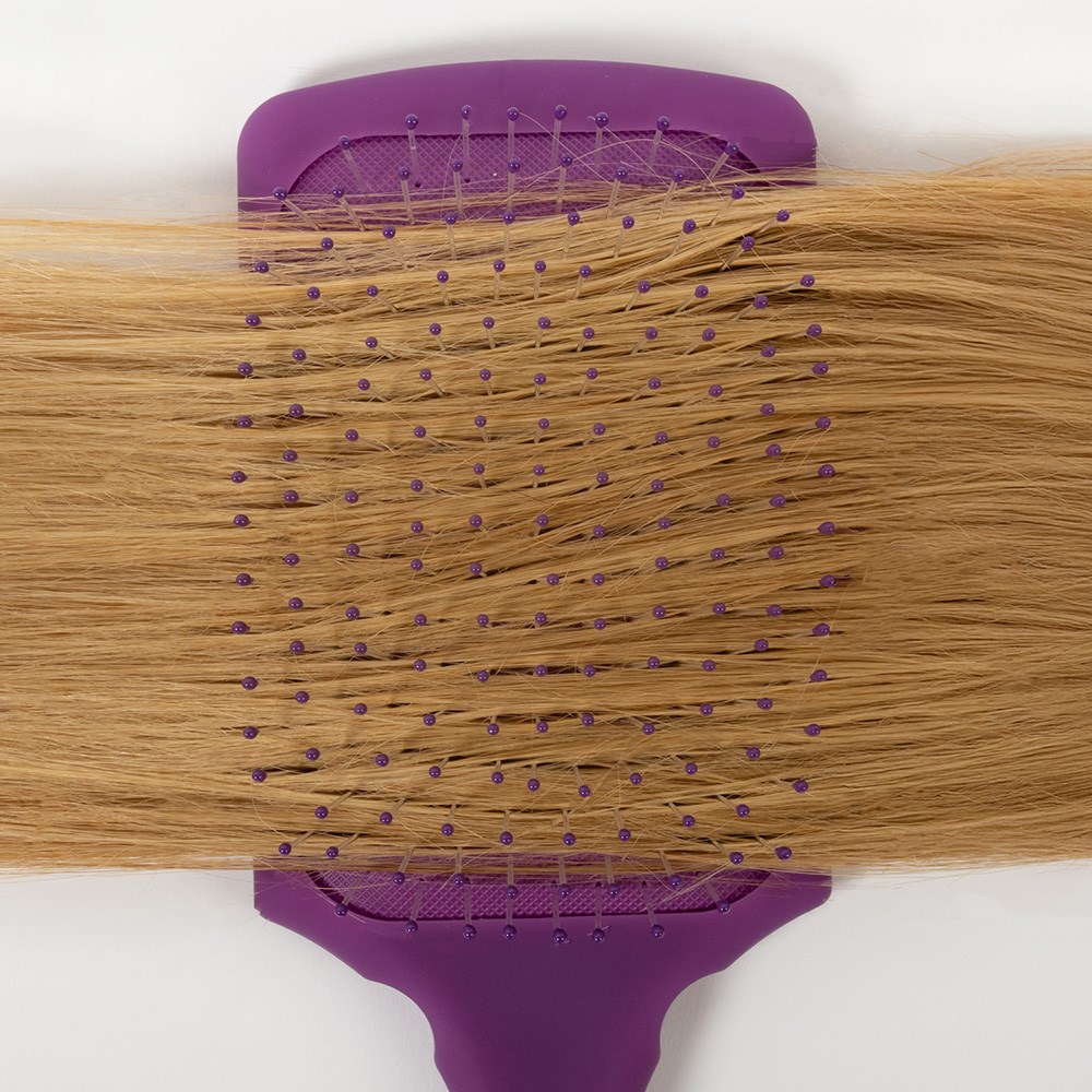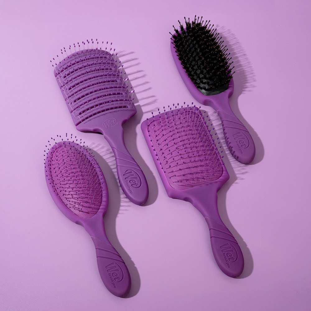 Meet the limited edition WetBrush Pro Frost Paddle Detangler in Purple. The 20% larger brush head and expanded cushion area glides through tangles faster. Exclusive, ultra-soft IntelliFlex bristles minimise effort, breakage and pain. AquaVent design allows for fast water drainage and easy clean-up, making this brush ideal for use with conditioning treatments and masks. Ergonomically advanced design features finger rests and rubberised EasyGrip handle for comfort and control, even when hands are wet.