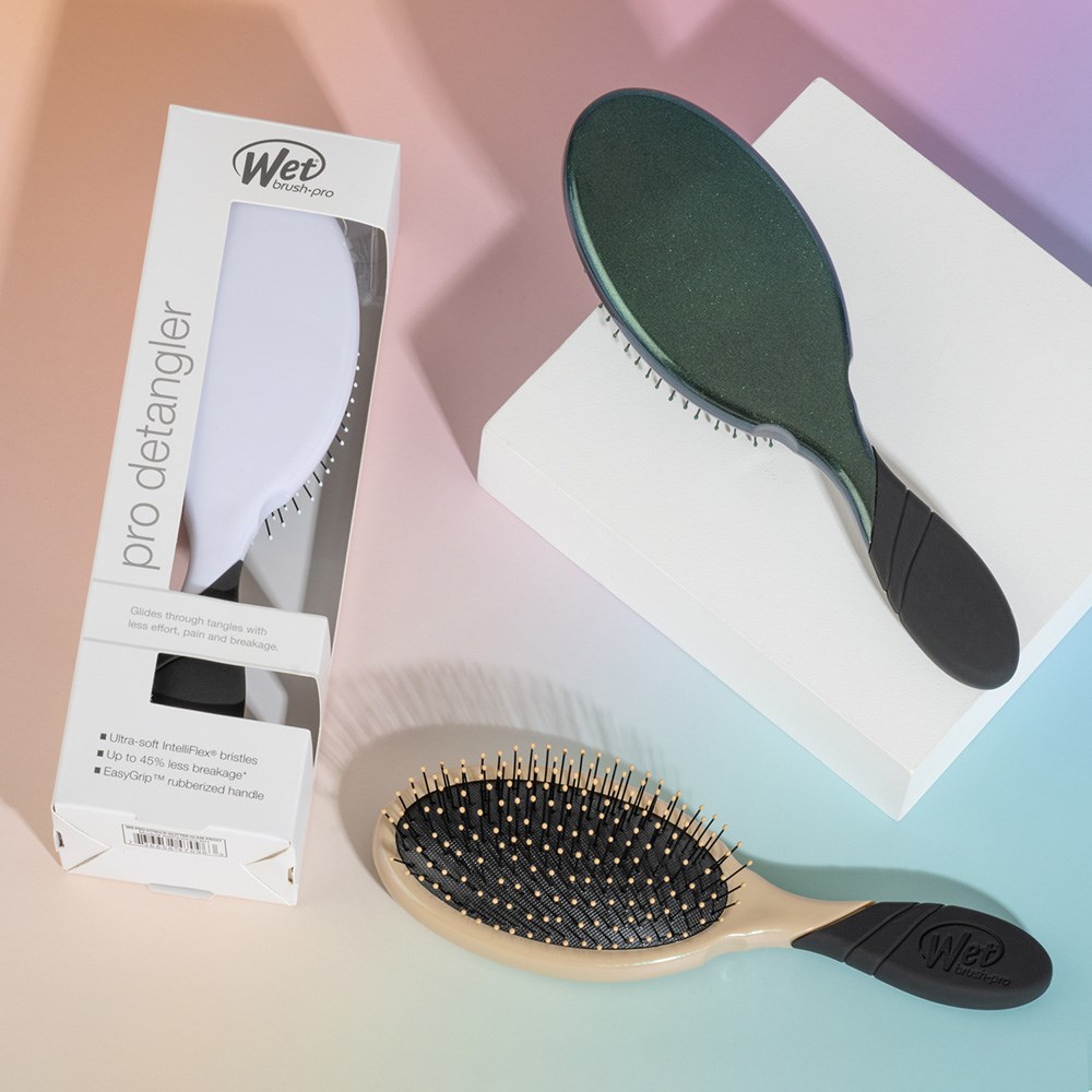 It’s time to sparkle and shine! WetBrush Pro Detangler Glitter Glam Champagne features a stunning, limited edition glitter design. This is the world famous, award-winning Original Detangler redesigned by stylists for stylists. Revolutionary IntelliFlex bristles diffuse knots on all hair types, wet or dry, gliding through tangles with less effort, less pain and over 45% less breakage**. Ergonomically advanced with finger rests and rubberised EasyGrip handle for more comfort and control of your Wet Brush.