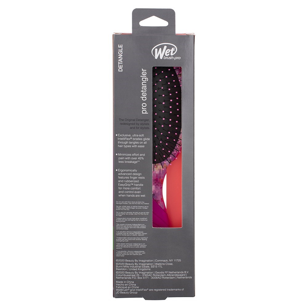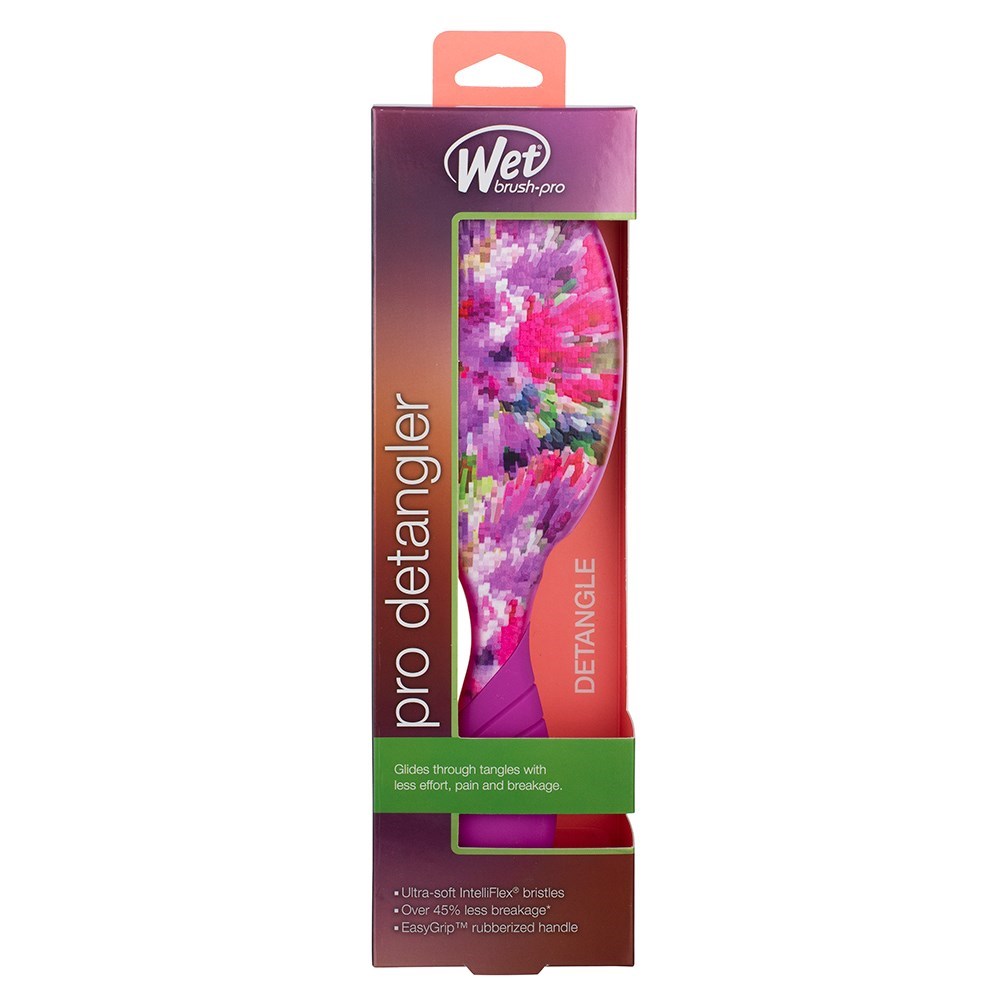 A pretty pop of detangling with WetBrush. The limited edition WetBrush Pro Petal Pop Detangler Brush Winter Aster is adorned in a floral-inspired pattern. Redesigned by stylists for stylists, this brush helps hair stay strong and healthy-looking. Exclusive IntelliFlex bristles loosen knots and tangles on wet or dry hair, without pulling or snagging. Ergonomically advanced design features finger rests and rubberised EasyGrip handle for more comfort and control, even with wet hands. With vibrant, flower-inspired pattern, this is truly a joyful detangler.