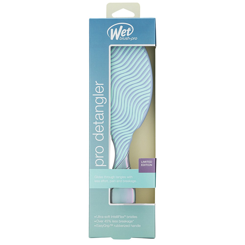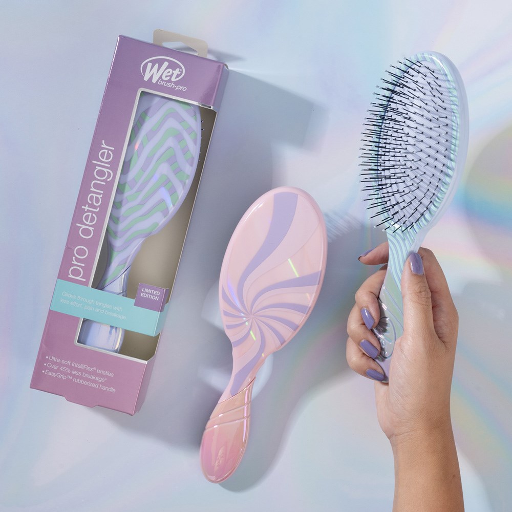 When detangling becomes a sweet delight! WetBrush Pro Vintage Sweets Detangler Blue features a limited edition, sweetly whirling design in pastel iridescence. This is the world famous, award-winning Original Detangler redesigned by stylists for stylists. Revolutionary IntelliFlex bristles diffuse knots on all hair types, wet or dry, gliding through tangles with less effort, less pain and over 45% less breakage. Ergonomically advanced with finger rests and rubberised EasyGrip handle for more comfort and control.