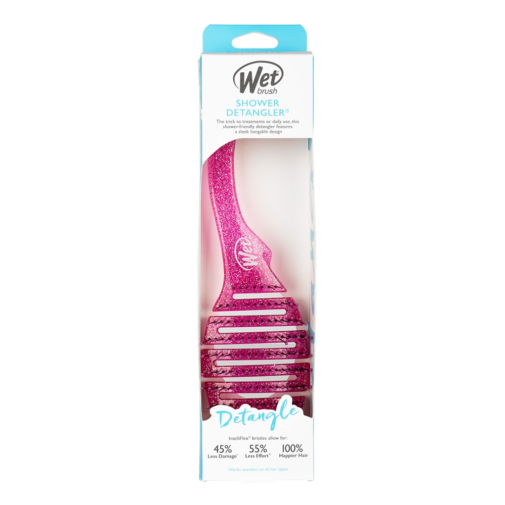 This sparkling brush knows how to multitask. WetBrush Shower Detangler Hair Brush Pink Glitter gently detangles while distributing conditioning treatments evenly in the shower. Designed without a cushion for easy cleaning and air drying – not to mention the convenient shower hook handle! Exclusive Wet Brush IntelliFlex bristles glide through tangles with ease.