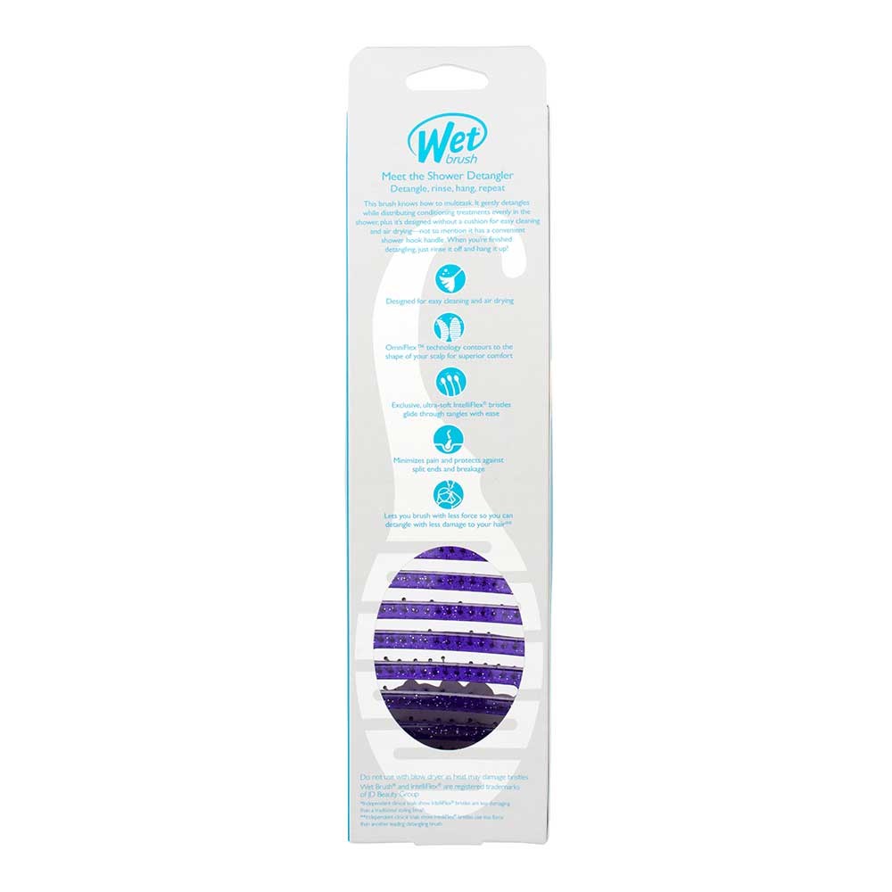 This sparkling brush knows how to multitask. WetBrush Shower Detangler Hair Brush Purple Glitter gently detangles while distributing conditioning treatments evenly in the shower. Designed without a cushion for easy cleaning and air drying – not to mention the convenient shower hook handle! Exclusive Wet Brush IntelliFlex bristles glide through tangles with ease.