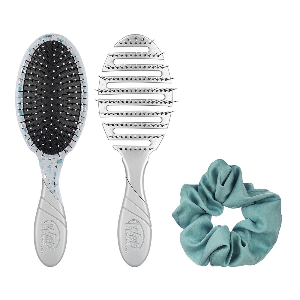 Detangle and style with less pain, effort, and breakage. The limited edition WetBrush Terrazzo Glam Detangler Kit includes the Wet Brush Pro Detangler, Wet Brush Flex Dry Hair brush as well as a coil scrunchie. Brush with the pro detangler for smooth glides through tangles or use flex dry to blow-dry your hair, the possibilities are endless. Style your hair with the cute, comfy, no pulling, secure hold coil scrunchie for another cool look. Perfect for creating daily looks, this ultra fun detangling and styling kit is perfect for everyone.