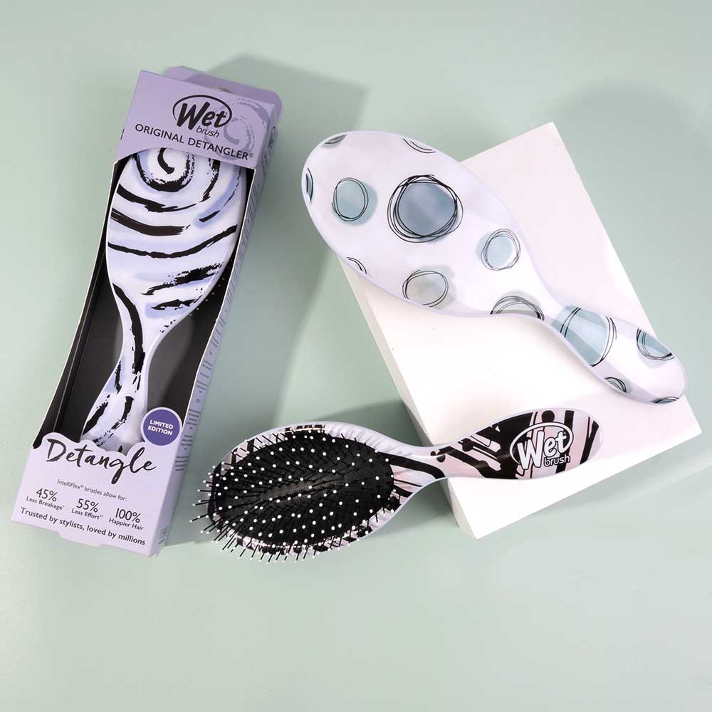 Brighten your day with the WetBrush Watercolour Motif Detangler Hair Brush Teal Dots. World famous exclusive IntelliFlex bristles loosen knots and tangles on wet or dry hair, without pulling or snagging. Letting you brush with less force resulting in less damage. The moment you use a Wet Brush Detangler, you’ll never want to try another detangling hair brush again.