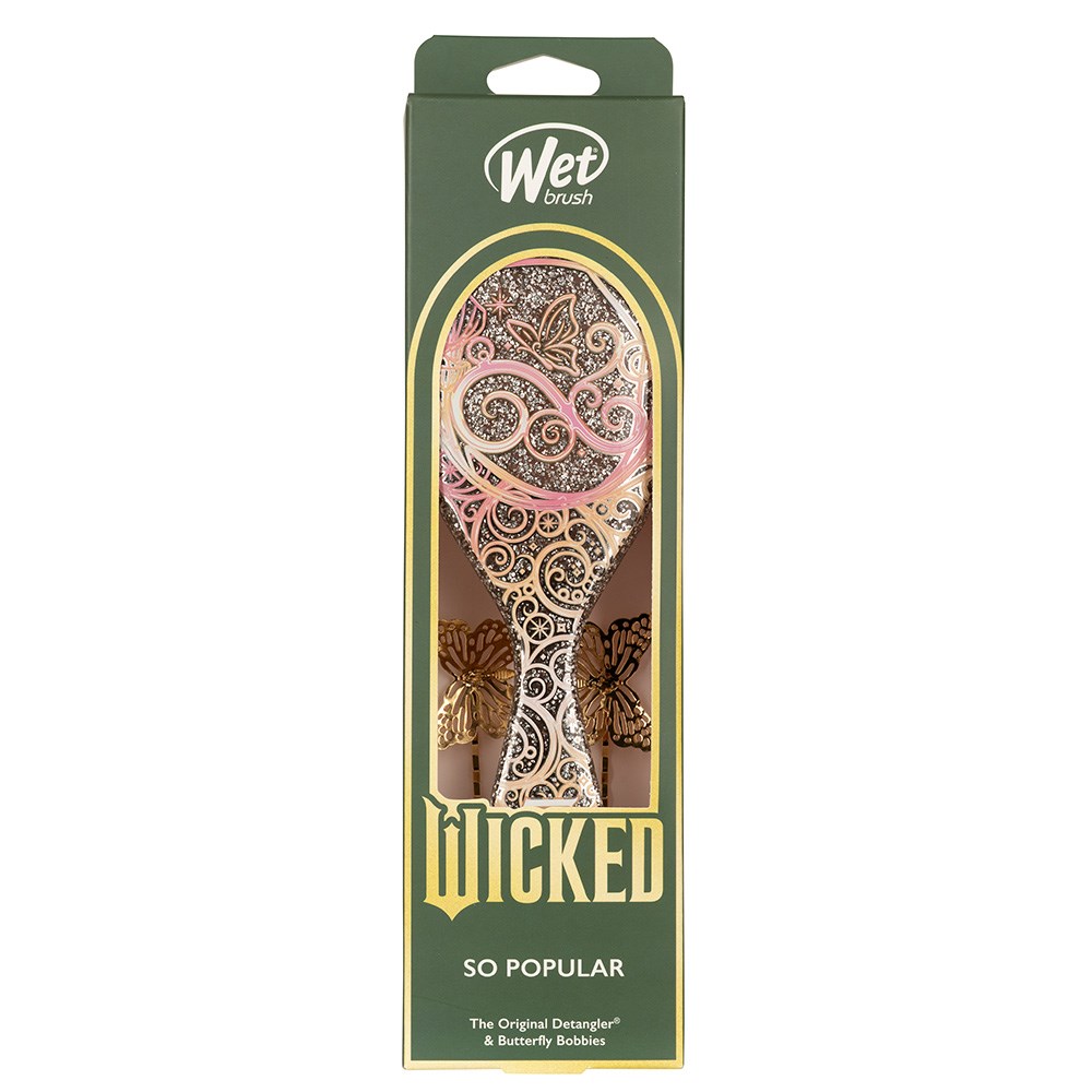 Defy tangles with the limited edition WetBrush Wicked Glinda Detangling Kit. Perfect for creating your daily looks, including detangling and styling, with less pain, effort and breakage. This Wet Brush kit includes the world famous Original Detangler with a Glinda inspired print, as well as two Butterfly Bobbies. 100% happier hair with the Original Detangler featuring exclusive IntelliFlex bristles, while the Butterfly Bobbies add some Glinda to your day.